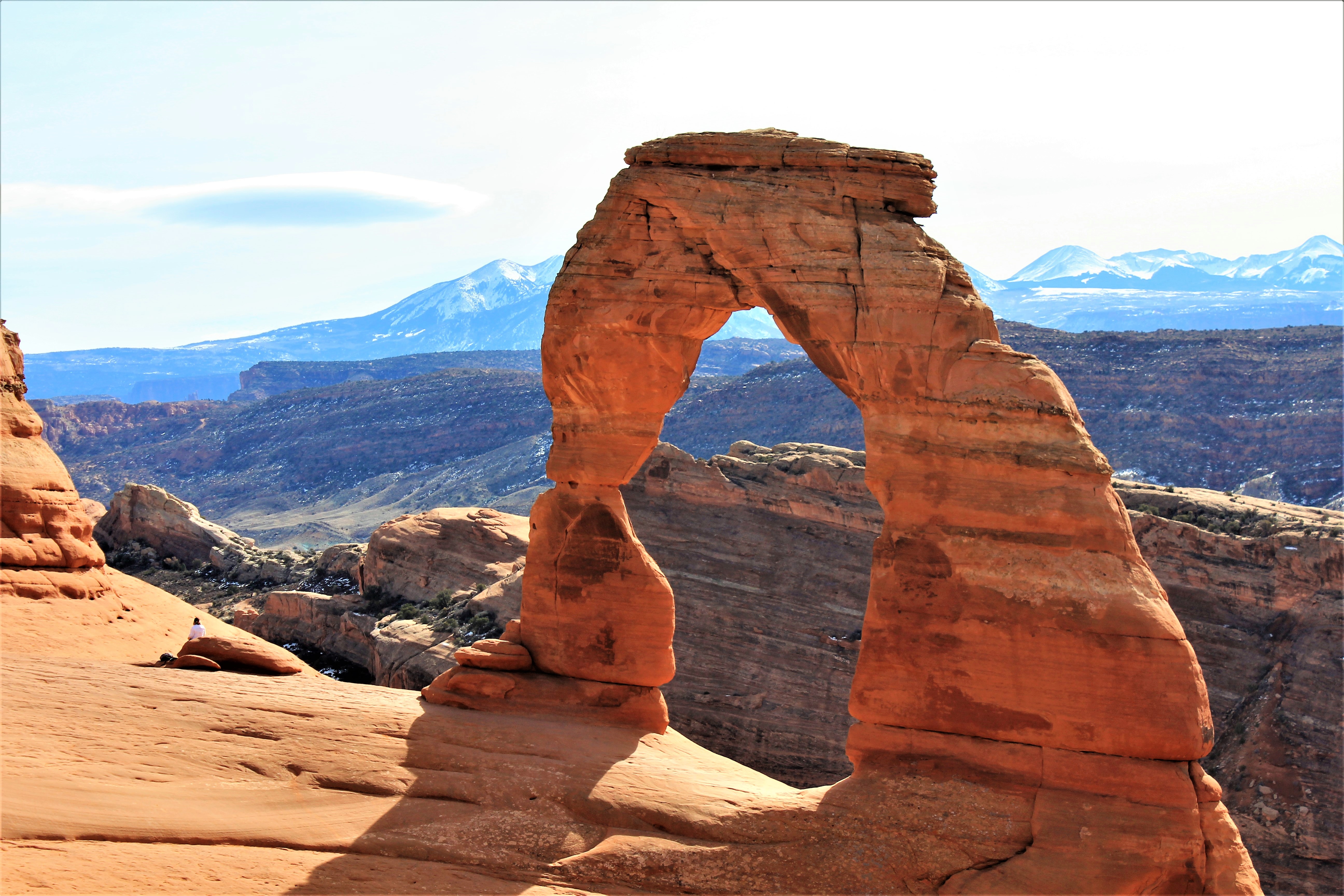 As it turns out, the hike to Delicate Arch was more of a steady climb, with a few instances where steep would be a better descriptor. At one point the trail broadens and crosses a field of pitted slick-rock, before returning to a series of turns on a narrower rock strewn trail. Near the top, perhaps the last 200 yards, the trail becomes a ledge with steep drops to my left. It was early in the day and where sun hadn’t hit, the ledge had spots of ice – just enough to make you pay close attention to each step. (I didn’t have enough water for a fall.) As you round the last turn and the arch suddenly comes into view, I am amazed by its height and width. It appears large even from a distance across the deep chasm that rests in front. There is one person standing beneath the arch and the juxtaposition reinforces the dimensions. It is a large, free-standing sandstone arch that has miraculously survived.