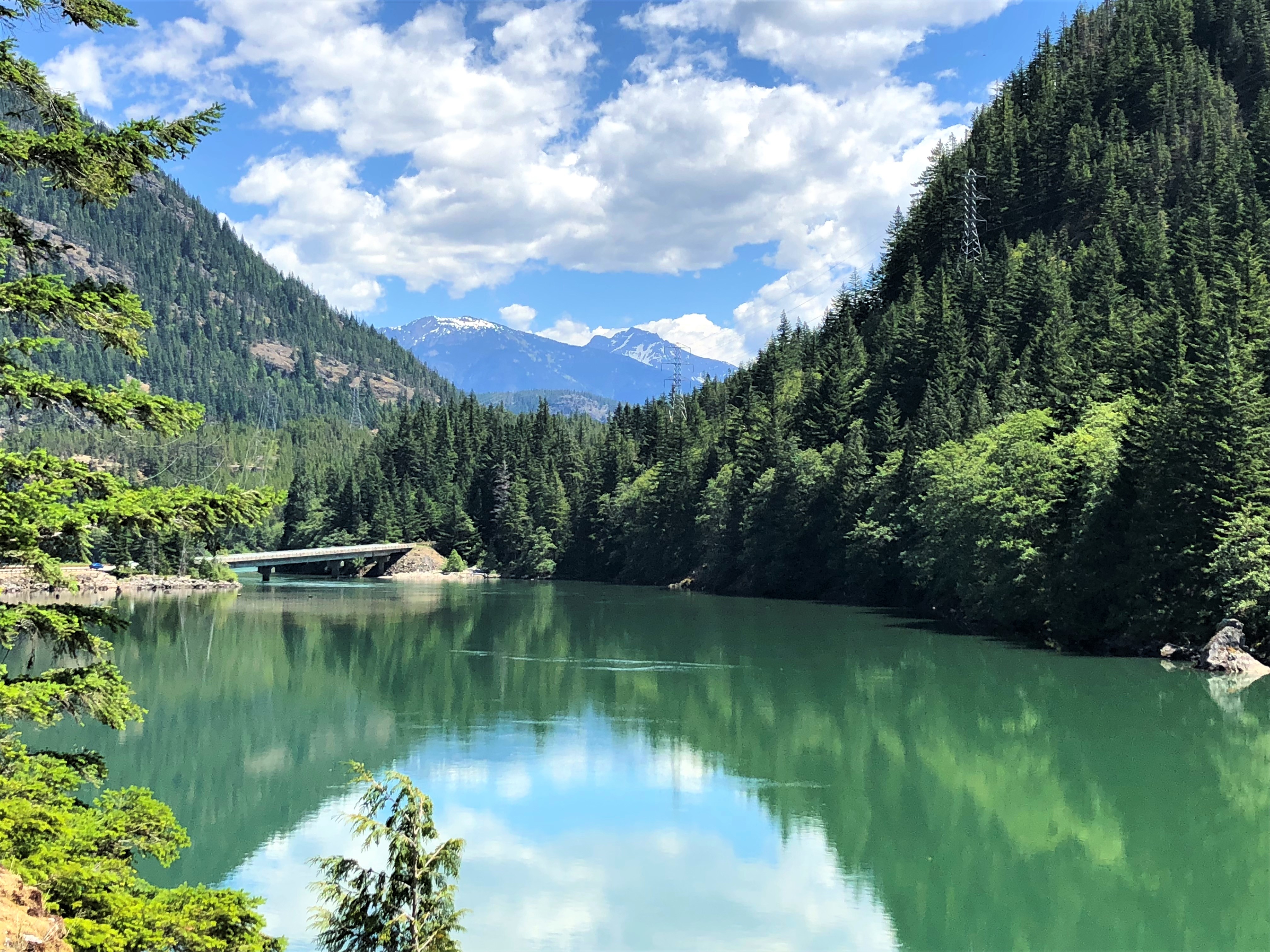 Diablo Dam Road juts out of North Cascades Highway at a forty-five degree angle. Immediately the road begins to descend. Narrow and flanked by thick cement retainers and an unforgiving vertical wall of granite, it twists down until the tall white lamp-posts standing guard atop the curving lip of the dam come into view. Below, turkish blue-green under the morning sun, Diablo Lake lays flat across the remains of Diablo Canyon. Skimming the lake for another mile, the thin road hugs her curves, never straying too far from the shore. Near the end, Diablo Lake trailhead sits off to the side of a rocky, unpaved, almost full parking lot.