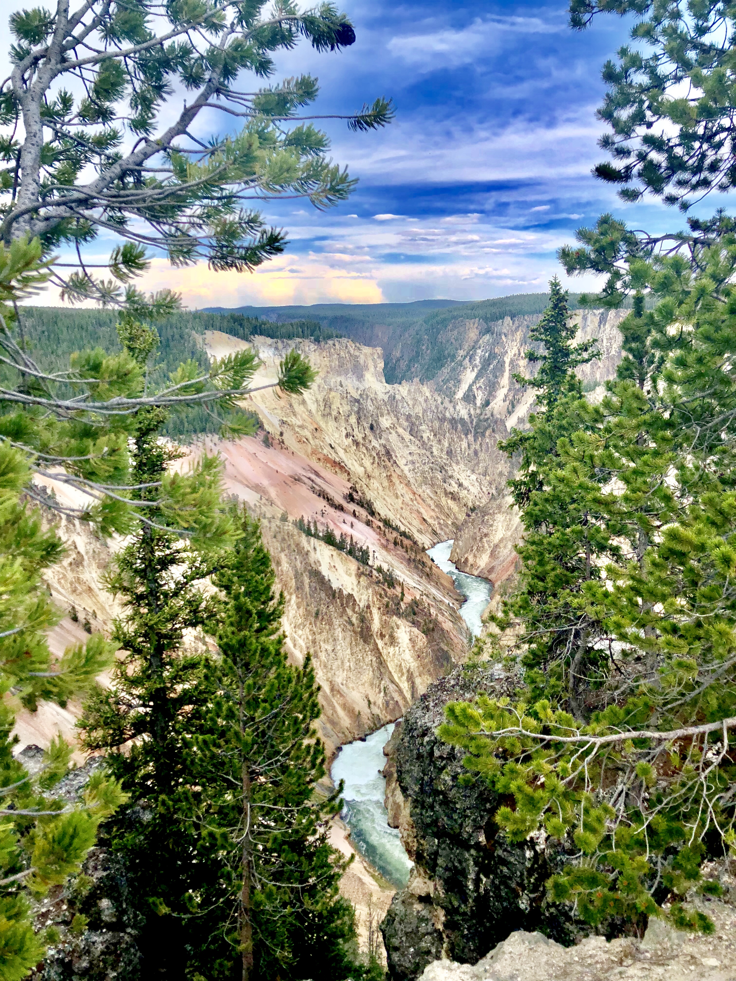 Looking down into the canyon toward Lower Falls, the first thing you notice isn’t the falls tumbling from the far horizon. It’s the canyon walls sloping down to the Yellowstone River. Flecked with green, heat and time have turned once brown rhyolite rock into shades of red, bright yellow and burnt orange. Shaped by 160,000 years of wind, water and hydrothermal activity, the canyon’s skirt of color drops toward the thunderous mint green river below. It is several minutes before I begin to take in the 308 foot falls flowing over volcanic rock.