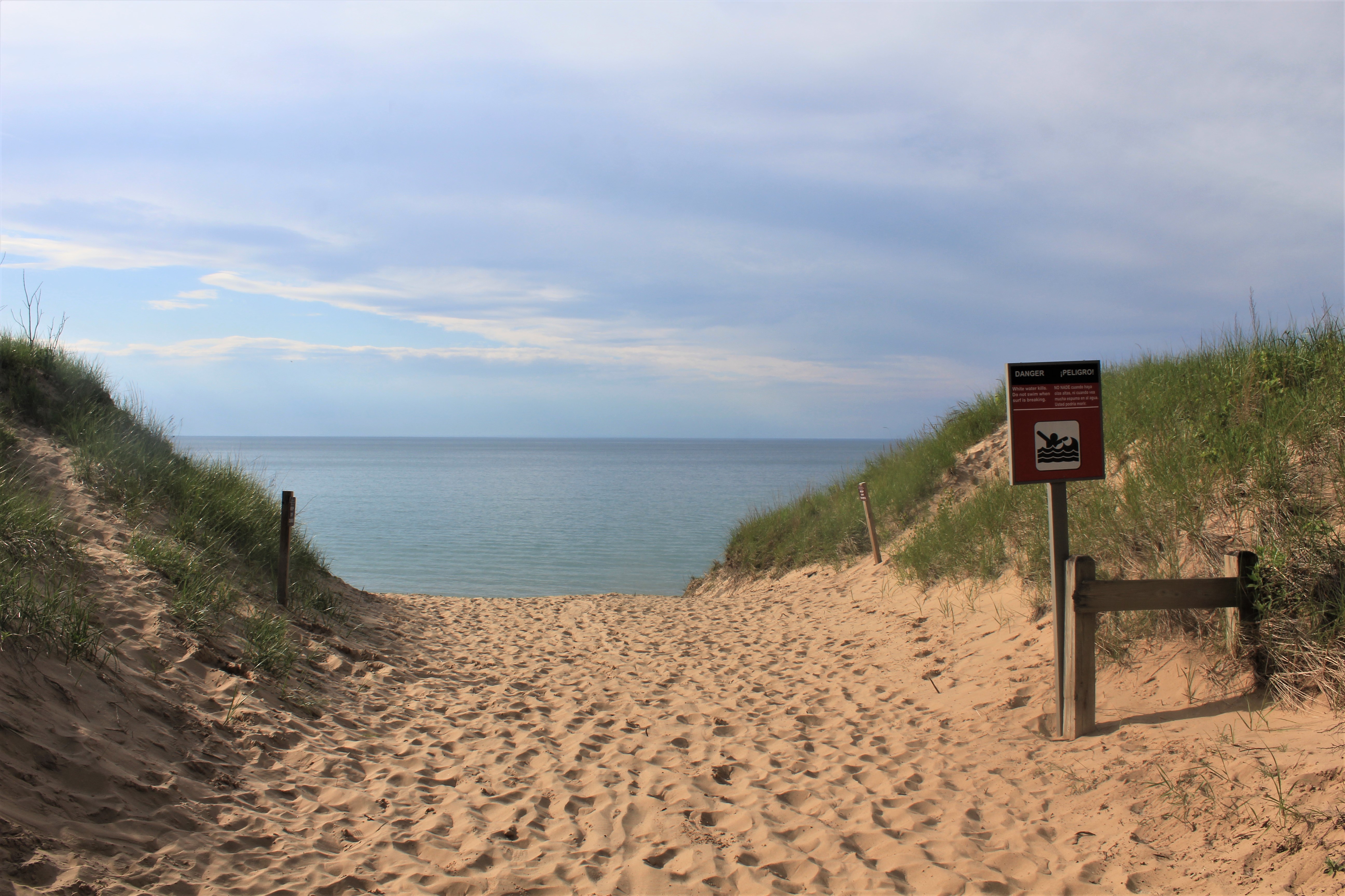 When I reach the summit of the final foredune, Lake Michigan lays rippled white and blue in the distance. As I carefully make my way down the face of a very steep dune, I grab tree branches and carefully seek out heavy roots to slow my descent. Near the bottom, with a golden sun low in the sky, I walk into a sea of marram grass swaying to a westerly wind. The path is narrow, almost swallowed by the whistling grass before reaching the deserted beach. Several large pieces of driftwood, silvered and smooth with age, lay on the beach. Resting on the horizon, like a slender mirage rising from the deep, the pale jagged skyline of Chicago glimmers in the sun. As I kick off my boots and walk into the water, I’m thinking of my two sons in the gleaming city 35 miles across the water.